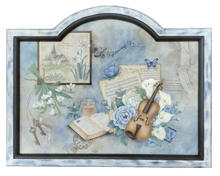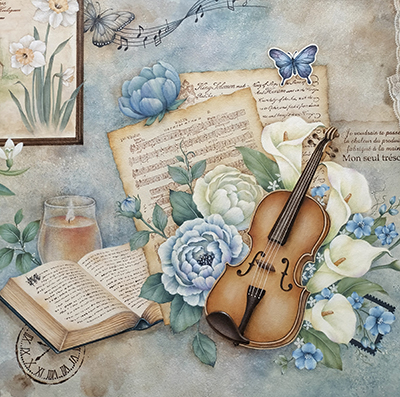 バイオリンの音色がその時々の気持ちを奏でてくれている様子をコラージュ要素を加えて描きました。