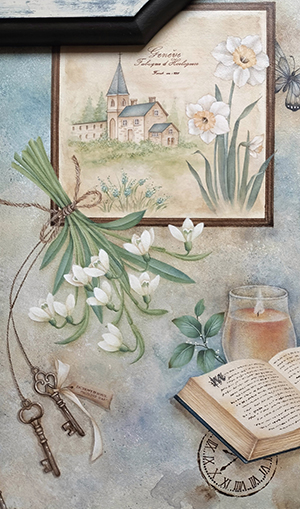 右上のレース模様や開いた本のうにょうにょの文字は手描きで頑張りました♪